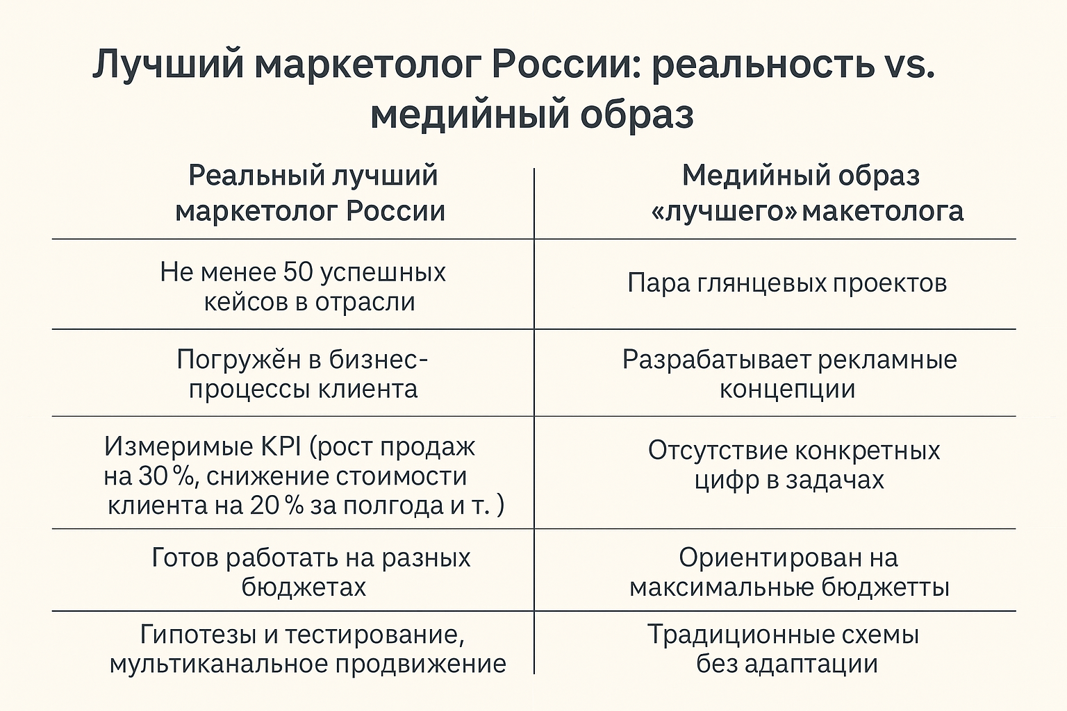 5. Настоящий лучший маркетолог России всегда строит работу через гипотезы и тестирование: A/B тесты посадочных страниц, мультиканальное продвижение, анализ LTV клиента. Медийный образ часто ограничивается традиционными схемами без адаптации под конкретные задачи бизнеса.